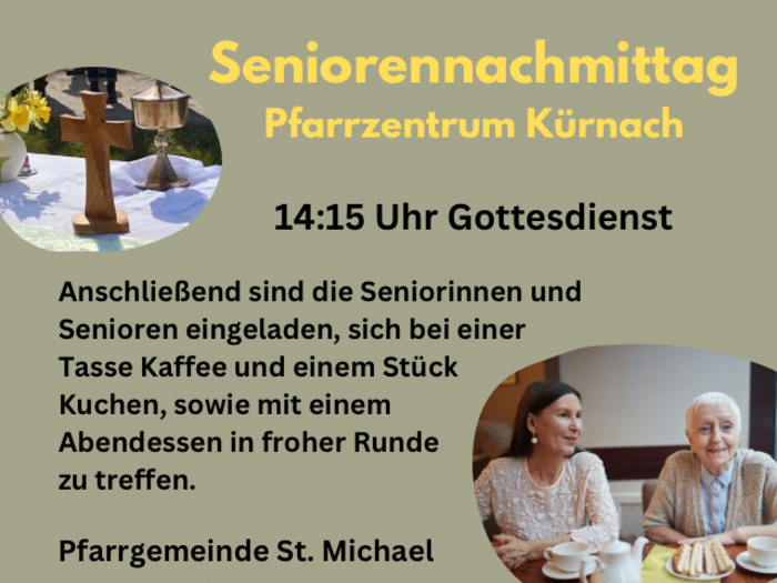 Einladung zum Gottesdienst um 14.15 Uhr im Pfarrzentrum, anschließend sind die Seniorinnen und Senioren eingeladen, sich bei einer Tasse Kaffee und einem Stück Kuchen, sowie mit einem Abendessen in froher Runde zu treffen.